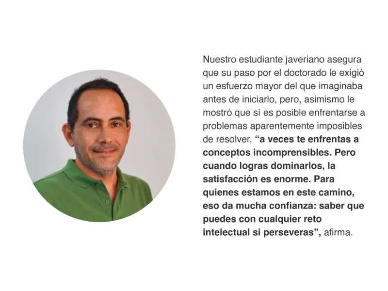 Fernando, es ingeniero de sistemas, especializado en Desarrollo de Software, magíster en Ingeniería, con una trayectoria de más de 20 años en la industria y en el mundo de la academia. Se interesó en cursar el doctorado porque le parecía el mejor camino para fortalecer sus bases científicas, pues es un convencido de que en la investigación está la verdadera fuente de la innovación y el cambio.